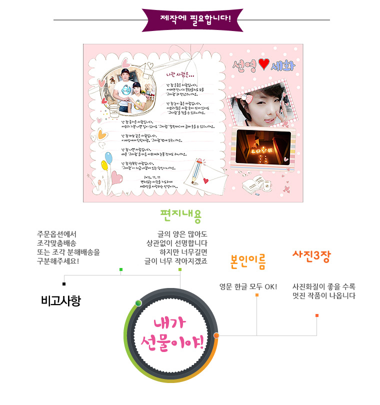 *주문접수후 제작에 필요한 사진과 문구등은 상세설명을 참고하시어 메일( sunmulday@naver.com ) 이나 카카오톡( 아이디:선물데이 )으로 보내주세요